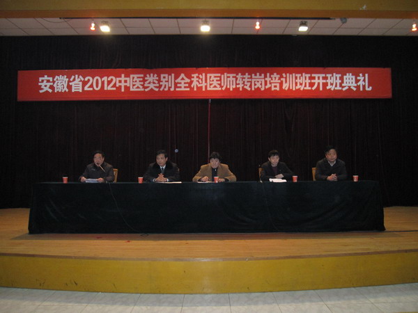 受安徽省卫生厅和省中医药管理局的委托,安徽中医学院继续教育学院于2012年2月举办2012年中医类别全科医师转岗培训班。培训班于2月13日上午在省工会干校礼堂举行了隆重的开学典礼。省中医药管理局肖锋副局长、王继学主任,安徽中医学院彭代银副校长,继续教育学院李瑞洲院长、刘世刚书记出席了大会,来自全省16个地、市的近100名学员参加了典礼。