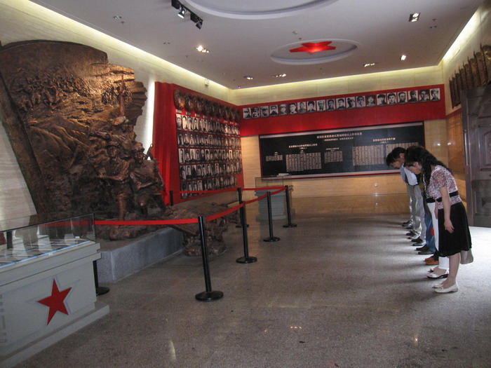 红军纪念堂里,全体党员为新中国而献身的革命先烈们默哀并三鞠躬。